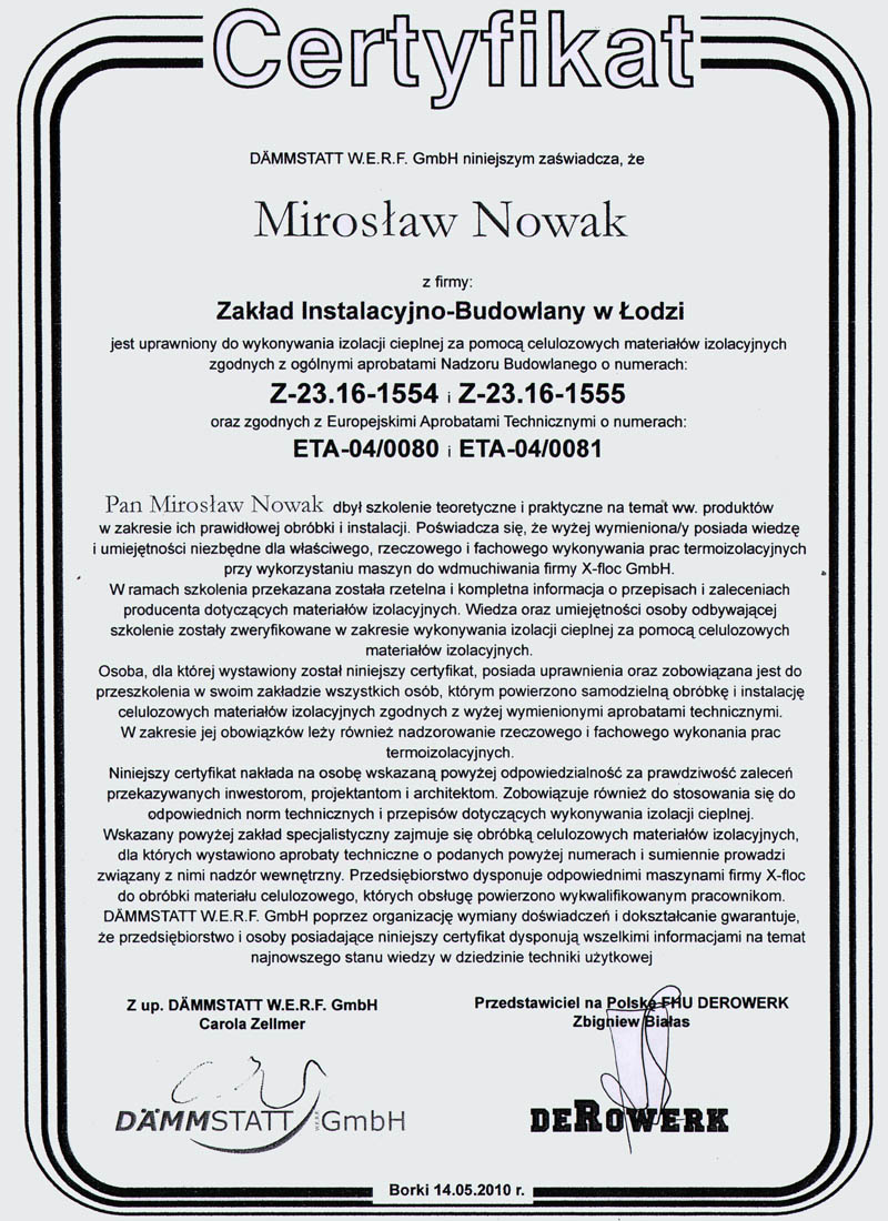 W protokole odbiorczym wykonawca dokumentuje uzyskane gęstości izolacji po zakończeniu wdmuchiwania wełny celulozowej.